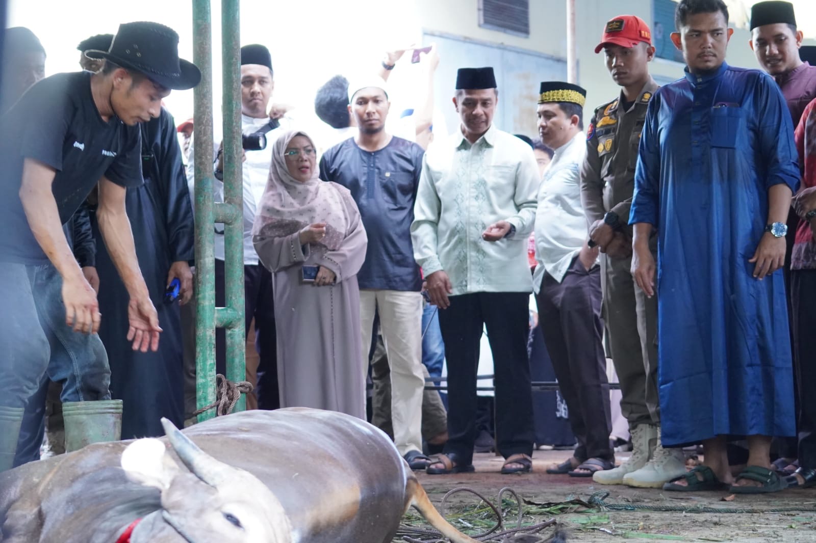 Bupati Kampar H Ahmad Yuzar didampingi Wakil Bupati Kampar Dr Hj Misharti, keluarga besar, para pejabat di lingkungan Pemdakab Kampar, pengurus Islamic Centre Bangkinang menyaksikan langsung pemotongan hewan kurban yang diawali dengan pemotongan sapi dari bantuan Presiden Republik Indonesia H Probowo Subianto.