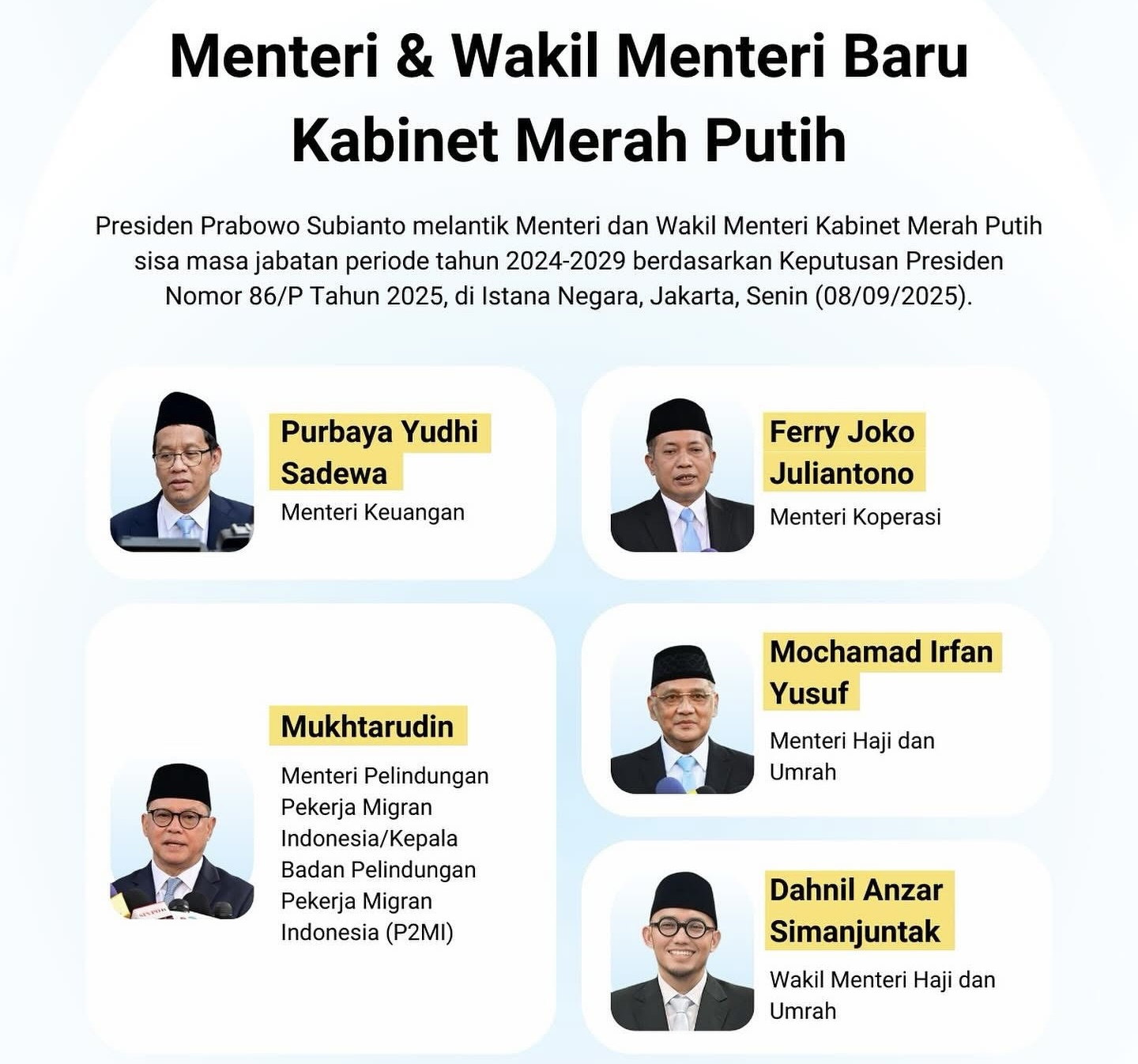 JAKARTA – Presiden Prabowo Subianto melantik empat menteri dan satu wakil menteri Kabinet Merah Putih sisa masa jabatan 2024-2029 di Istana Negara, Jakarta, Senin (08/09/2025).